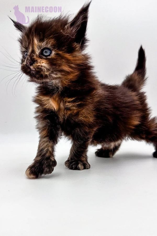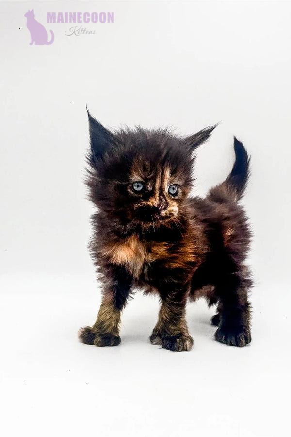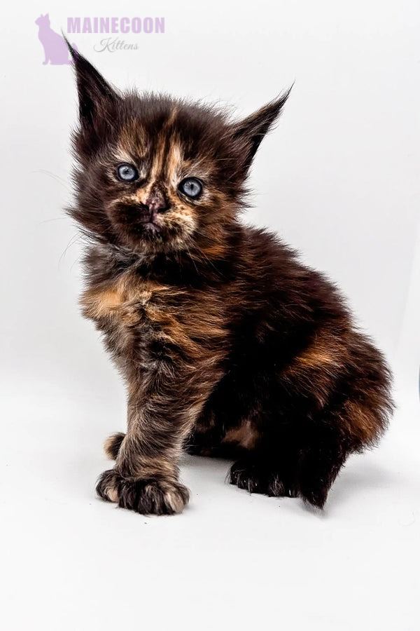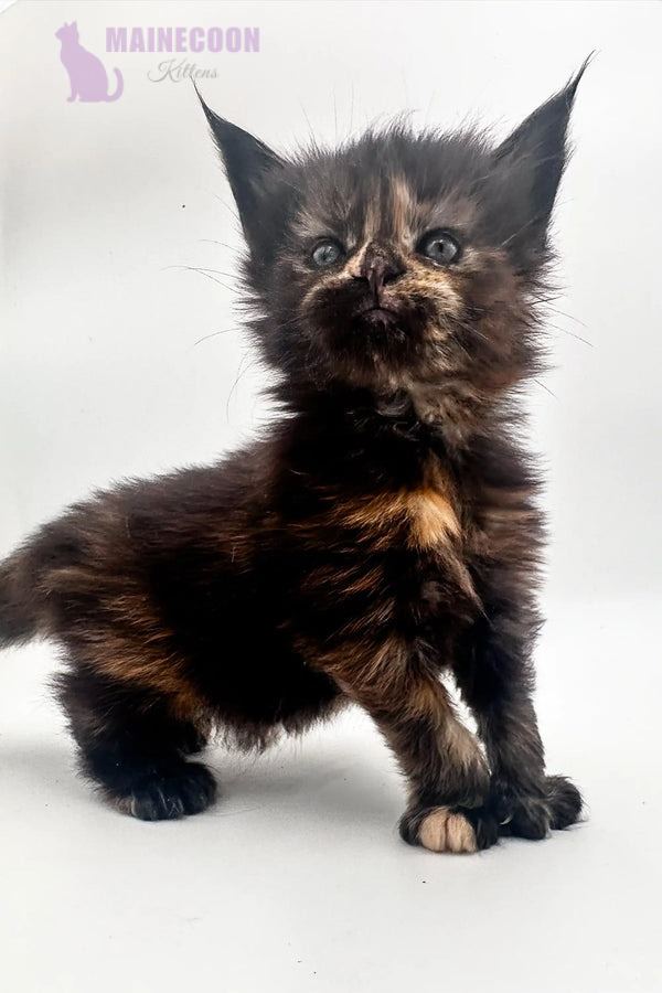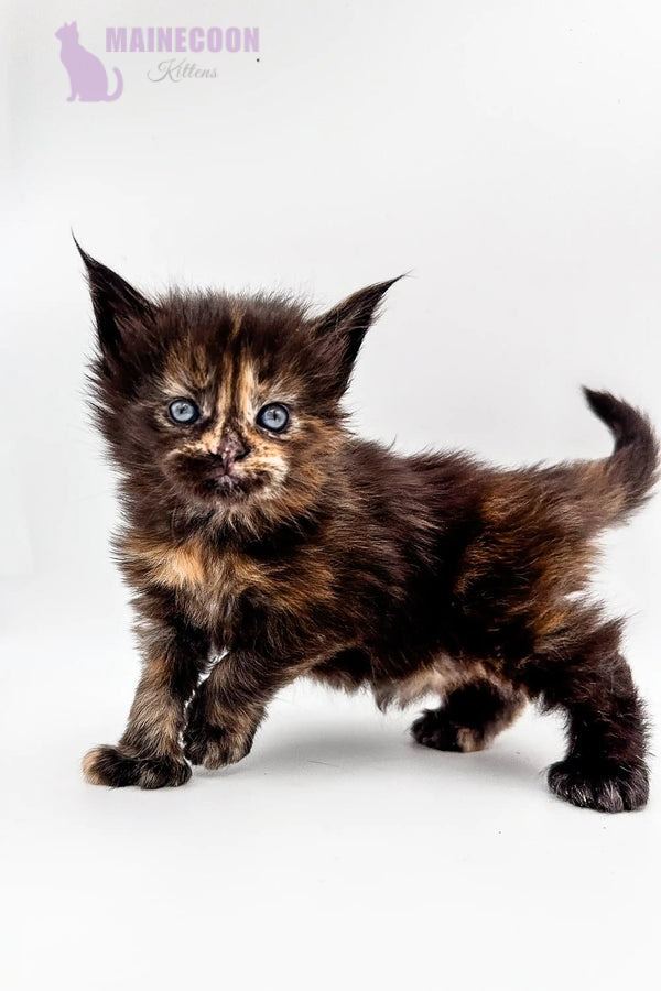 Stesha is a breathtaking polydactyl Maine Coon cat with rare features. She has six toes on every paw, both front and back. Her black tortoise coat gleams with elegance, and her green eyes shine with intelligence. Stesha is not just beautiful; she’s unique.