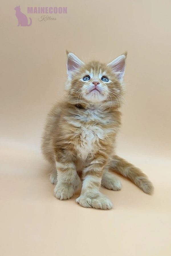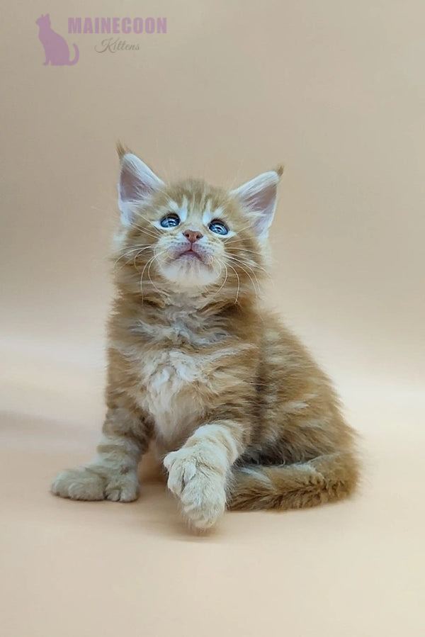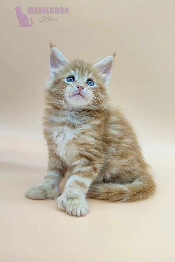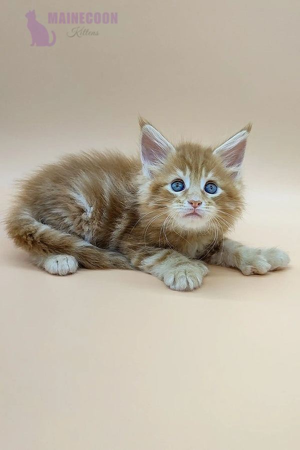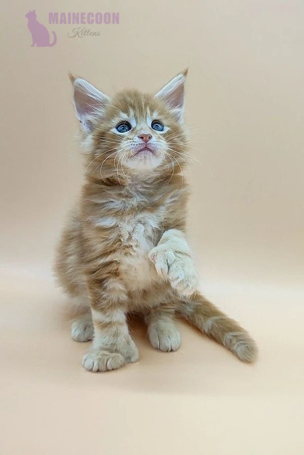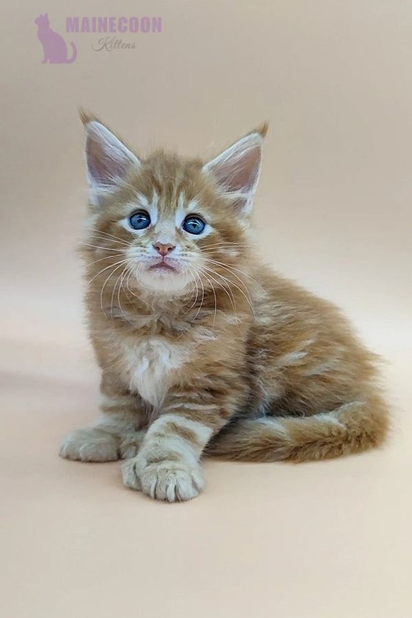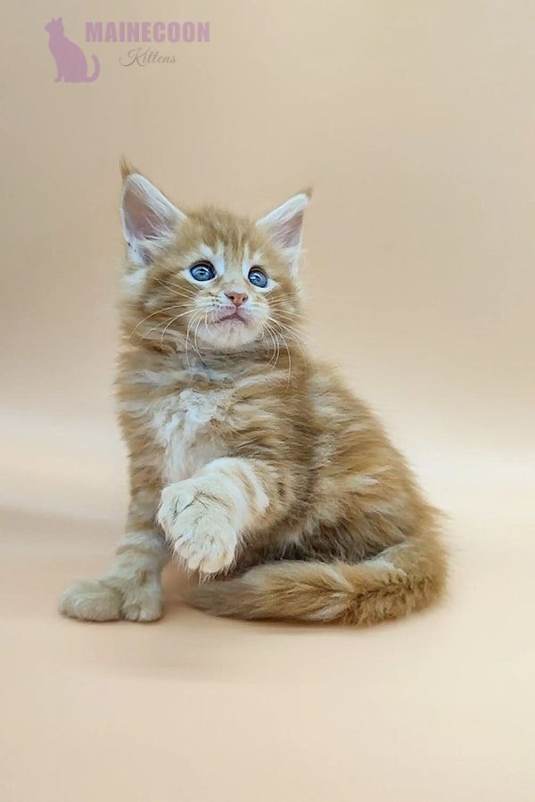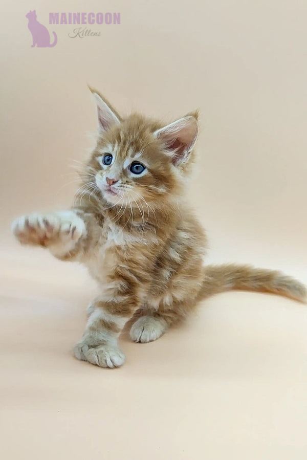 Oliver is a rare polydactylMaine Coon tabby kitten with a striking red blotched coat and stunning green eyes. This unique kitten combines elegance with a playful nature, making him unforgettable to every cat lover.