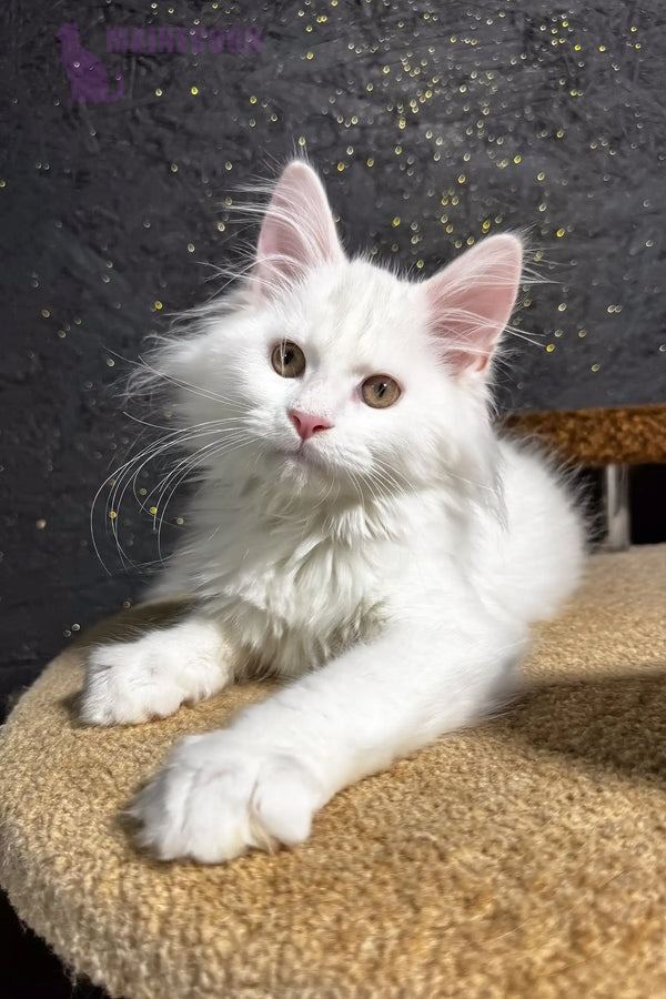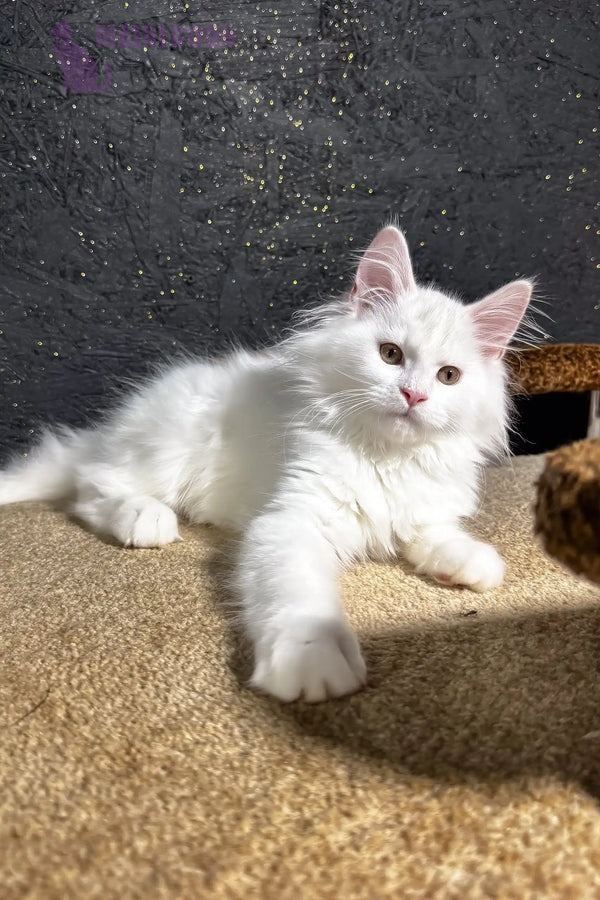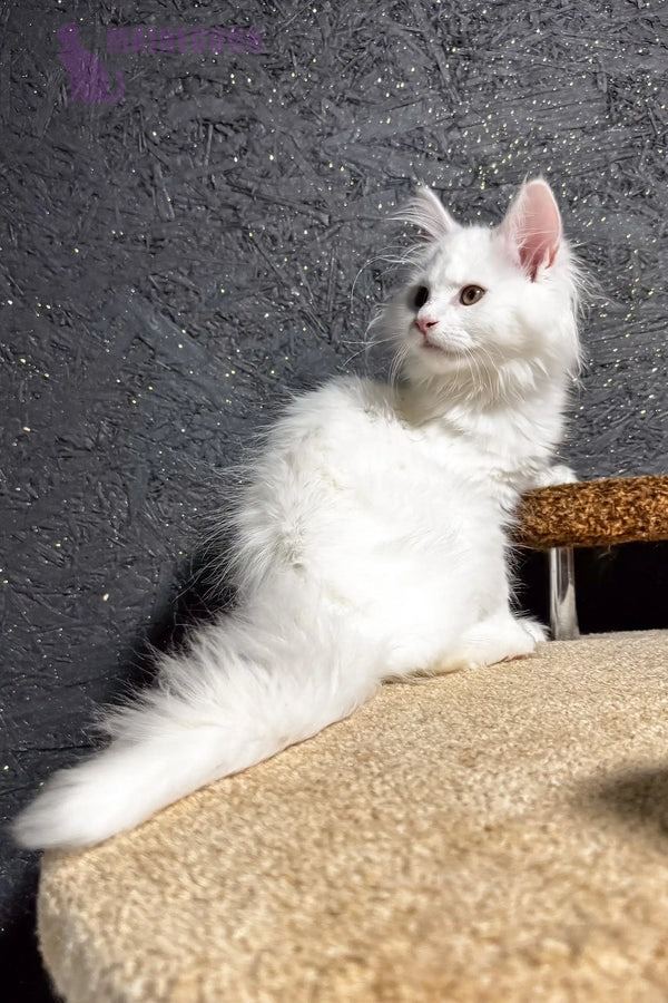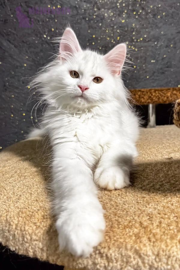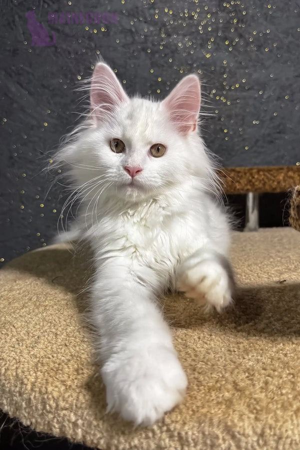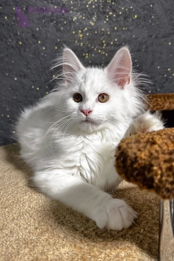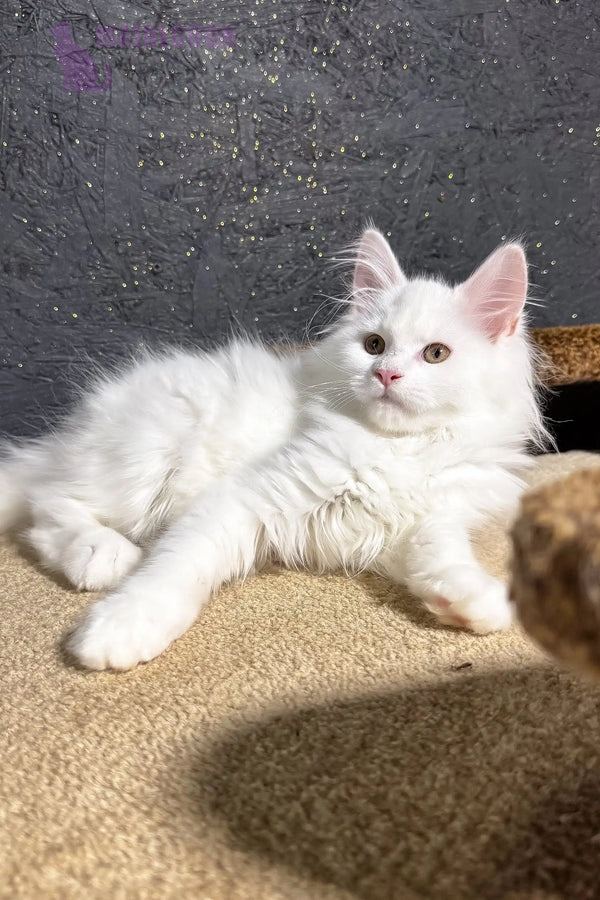 Hi, I’m Aisha—a six-month-old maine coon maine kitten with a snow-white coat and bright green eyes. My eyes catch every detail, and my paws move like a gentle dance. I’m curious, confident, and full of life. My personality shines through in everything I do.